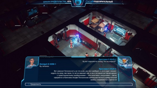 И тот самый коллега, что предложил взломать дверь, первым же на нас и настучит. Поэтому игра частенько разыгрывает сцены ссор между напарниками в отряде. Однажды пришлось даже пристрелить коллегу, у которой были свои цели во время миссии. Ну и вообще атмосфера чёрного юмора и в то же время тотальной паранойи передана отлично. На загрузочных экранах попадаются надписи из серии «Как у вас настроение? Помни: радоваться обязательно!» Герой тут может обвинить кого-нибудь в предательстве и выдать, например, такое: «Вы притворяетесь, что не знаете того, что вы знаете, потому что знаете, что если я узнаю, что вы знаете то, что вы знаете, то больше уже ничего не узнаете. Когда вам в последний раз пылесосили мозг?»